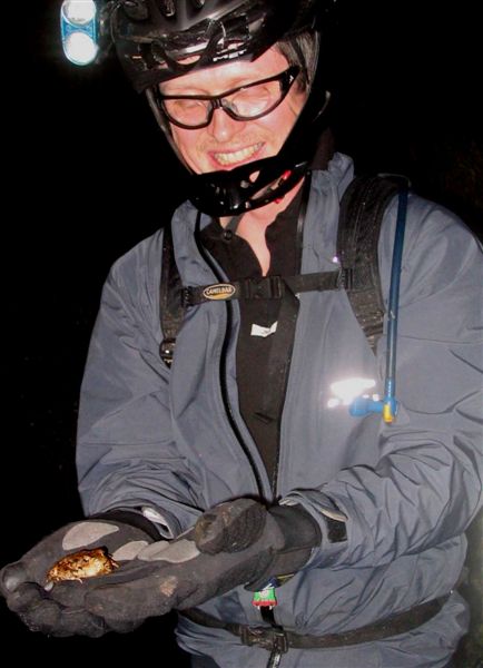 Crew : Eric, Pete, Kersh, Andy, Coley, 3sheds, Paul The Dentist, Mawds ---- * ---- A Classic Tegg's Nose - Macc Forest Circuit , the "four hills route" : Mild, no wind, but very chilly on leaving the pub 3sheds shows off his new full susser PTD did a spectacular over the bars off in Macc forest Frogs & Toads all over the place plus plenty of hooting and screeching owls. Beverages and nosh (imported Fish & Chips & Mushy thanks to Mawds) at the St Dunstan's..but, alas, no Natalie ---- * ---- |